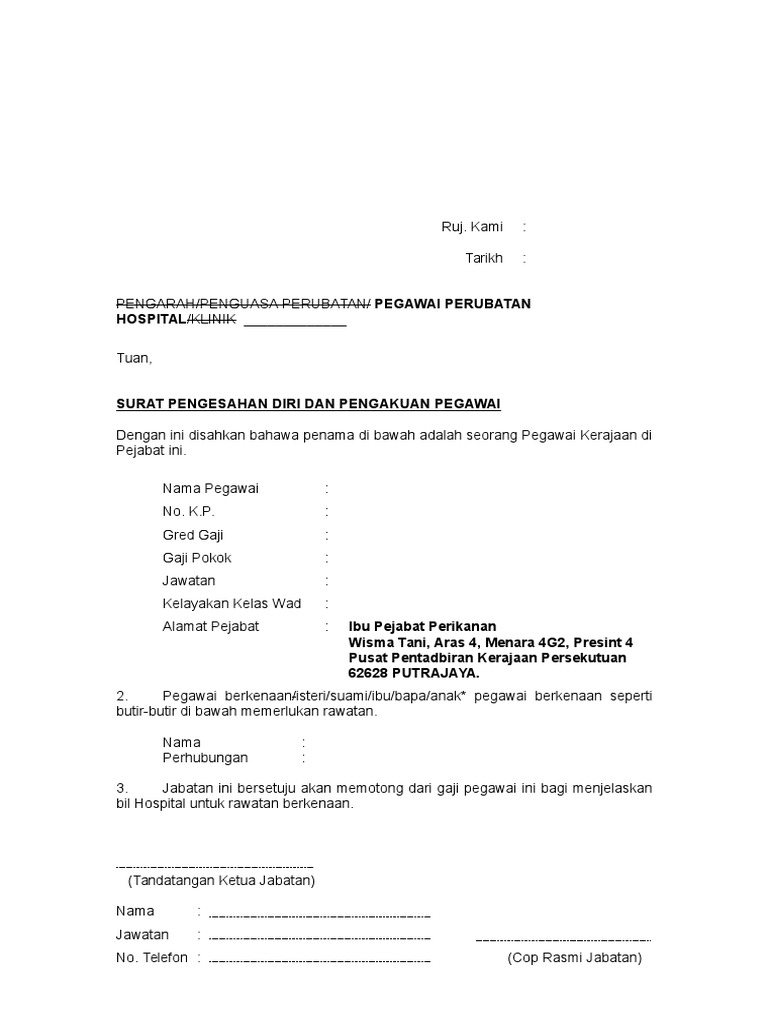 . Untuk membolehkan ahli keluarga kita mendapatkan rawatan di hospital kita perlu berikan surat pengesahan diri dan pengakuan pegawai. Contoh surat mohon pengesahan sijil cuti sakit. Semua cuti sakit hendaklah dihabiskan di hospital rumah pegawai melainkan jikalau ditetapkan oleh seorang pegawai perubatan sebaliknya.